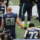 - Justin Britt, who is white, put his arm on Michael Bennett’s shoulder as Bennett sat during the national anthem on Friday night. Bennett had called for a white player to join the protest that seeks to call attention to social injustice.